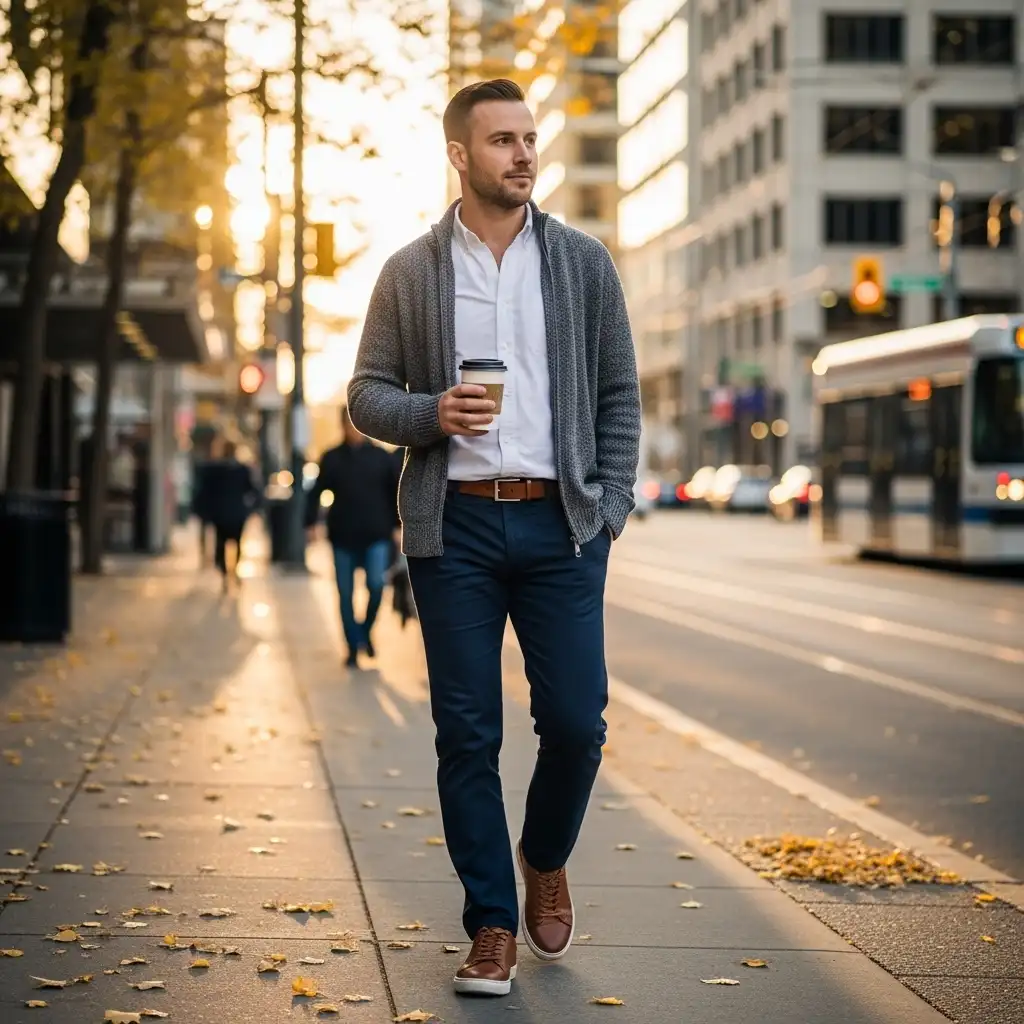 Start with navy blue chinos and a white Oxford shirt. Top it with a gray zip-up knit jacket and brown leather sneakers. This is the perfect middle ground between dressed-up and casual. The zip-up knit provides the shape of a jacket with the comfort of a sweater. Choose a knit that is heavy in weight—too light knits feel too thin and tacky.