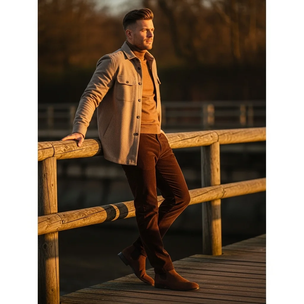 Begin with wale-wide tan corduroy pants and a forest green crewneck sweater. Add a tan suede bomber jacket and desert boots in brown leather. Corduroy is where it’s at today, and this outfit is taking advantage of its nubby appeal. The secret is the proper wale width—in wider wales, it’s hipper and more modern-looking. Press your corduroy pants and keep them clean and fresh, and avoid extremely baggy and sloppy cuts.