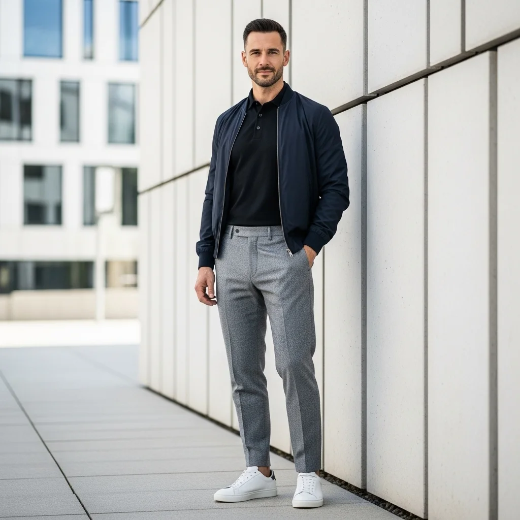 Combine gray wool trousers with a black performance wear polo top. Top it with a crisp navy bomber jacket and white leather low-top sneakers. This is the mixed look for today’s guy who must be accommodating. Select a polo that has a built-up collar that doesn’t slump, and have your bomber be narrow-gauge—nothing saggy or bulky.