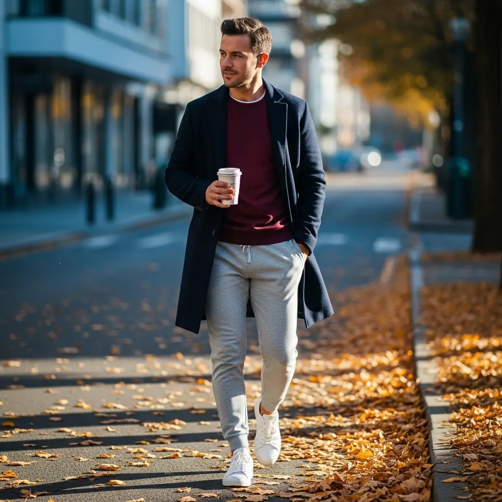 Pair light gray sweatpants with a burgundy crewneck sweatshirt. Over the top, add a navy wool overcoat and cap things off with skinny white sneakers. The ensemble is proof that fashion and comfort do not have to be mutually exclusive. A fitted overcoat transforms lounging clothes into streetwear in an instant. Choose tapered-at-the-ankle sweatpants that don’t have cargo pockets so the trim lines are not disrupted, and ensure your overcoat is wool and not polyester so it’s a more streamlined drape.