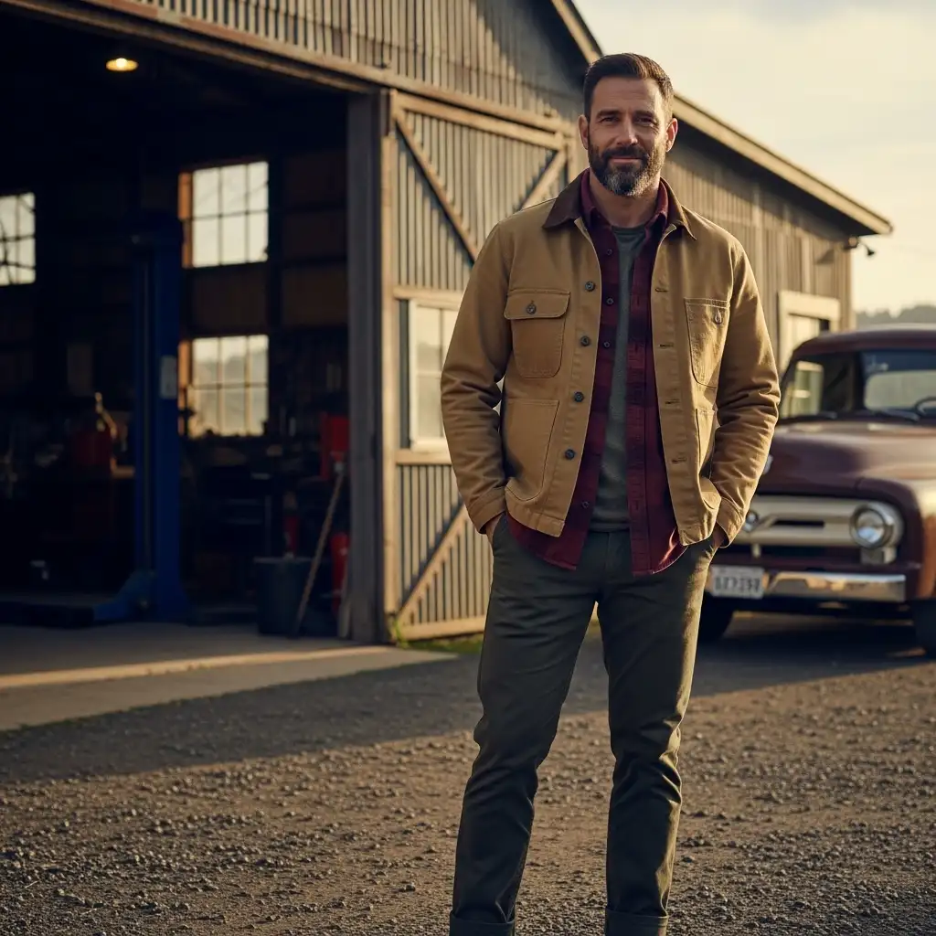 Begin with a khaki canvas chore jacket with multiple pockets and visible stitching. Match it with a burgundy flannel shirt under it and dark olive chinos. Finish with brown work boots and a plain canvas belt. It’s a nod to utilitarianism at no loss of aesthetics. The trick is proportion balancing—the chore jacket in a fitted style should be in close quarters near your body but not so tight, and your chinos should be straight- or slim-straight-legged. Roll the sleeves of your flannel up to the elbow when wearing the jacket open for additional depth.