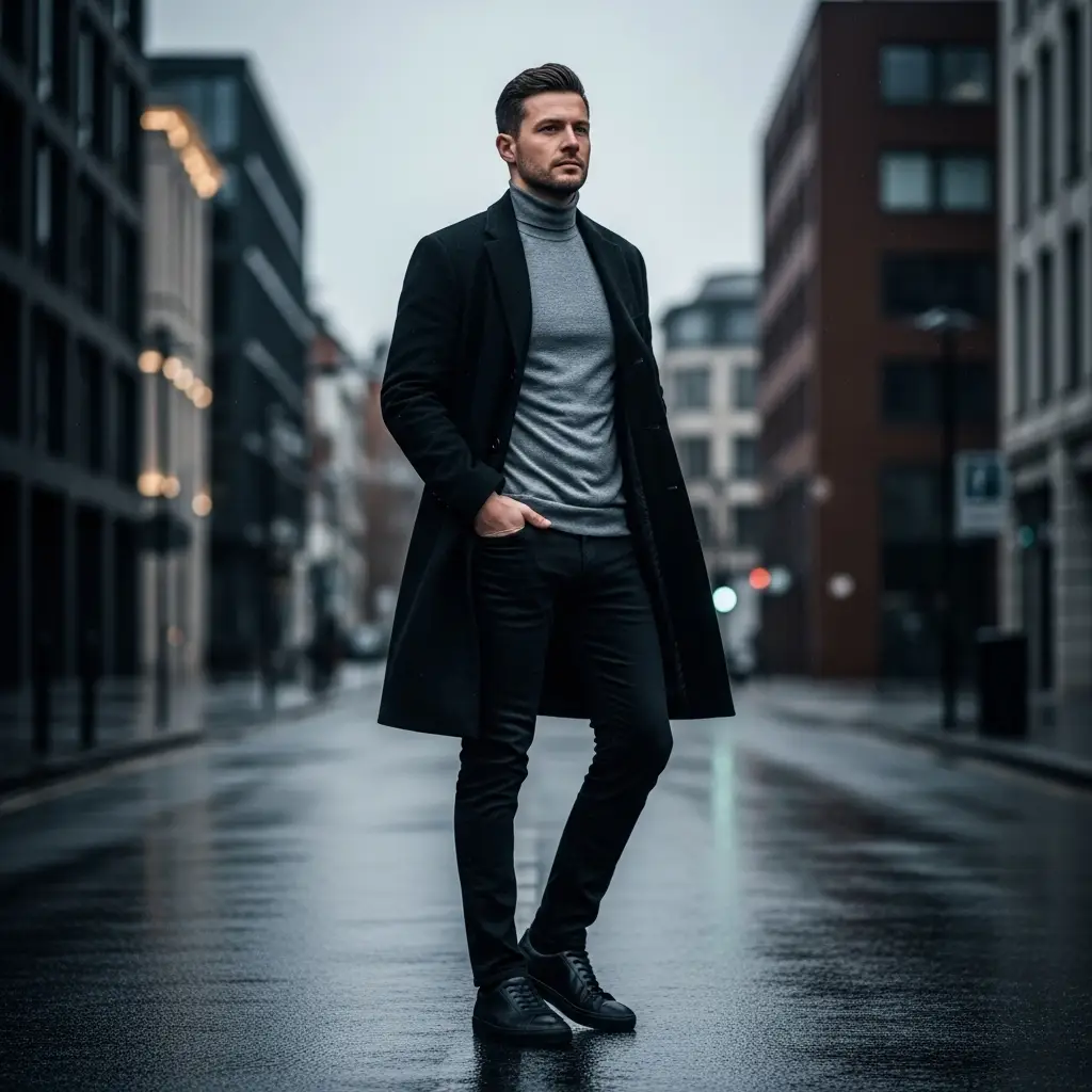 Keep the look streamlined with a charcoal gray turtleneck sweater and black slim-fit jeans. Add a black wool overcoat and black leather sneakers or boots. All-black is great because it creates a streamlined silhouette that is inherently lean and chic. It’s all about texture mixing—the luster of the turtleneck and the nap of the woolen coat bring a splash of visual interest. Provide a proper fit to everyone because pilling and bad-fitting garments are even more noticeable on simply-coloured ones.