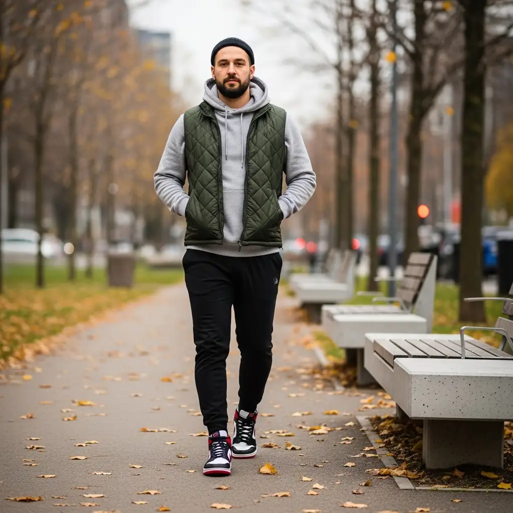 Black jogger-style pants are paired with a grey heavyweight hoodie. Dark green quilted top and vest are layered over the hoodie to complete the look with neutral-colored high-top sneakers. The style is one of comfort, edged with understated style. The addition of the quilted top brings a sense of elegance which softens what would otherwise be unapologetically rough in tone. Select joggers with slim ankles and little branding to get a clean look, and ensure your hoodie is not too big—keep it tight to the body to get a modern look.