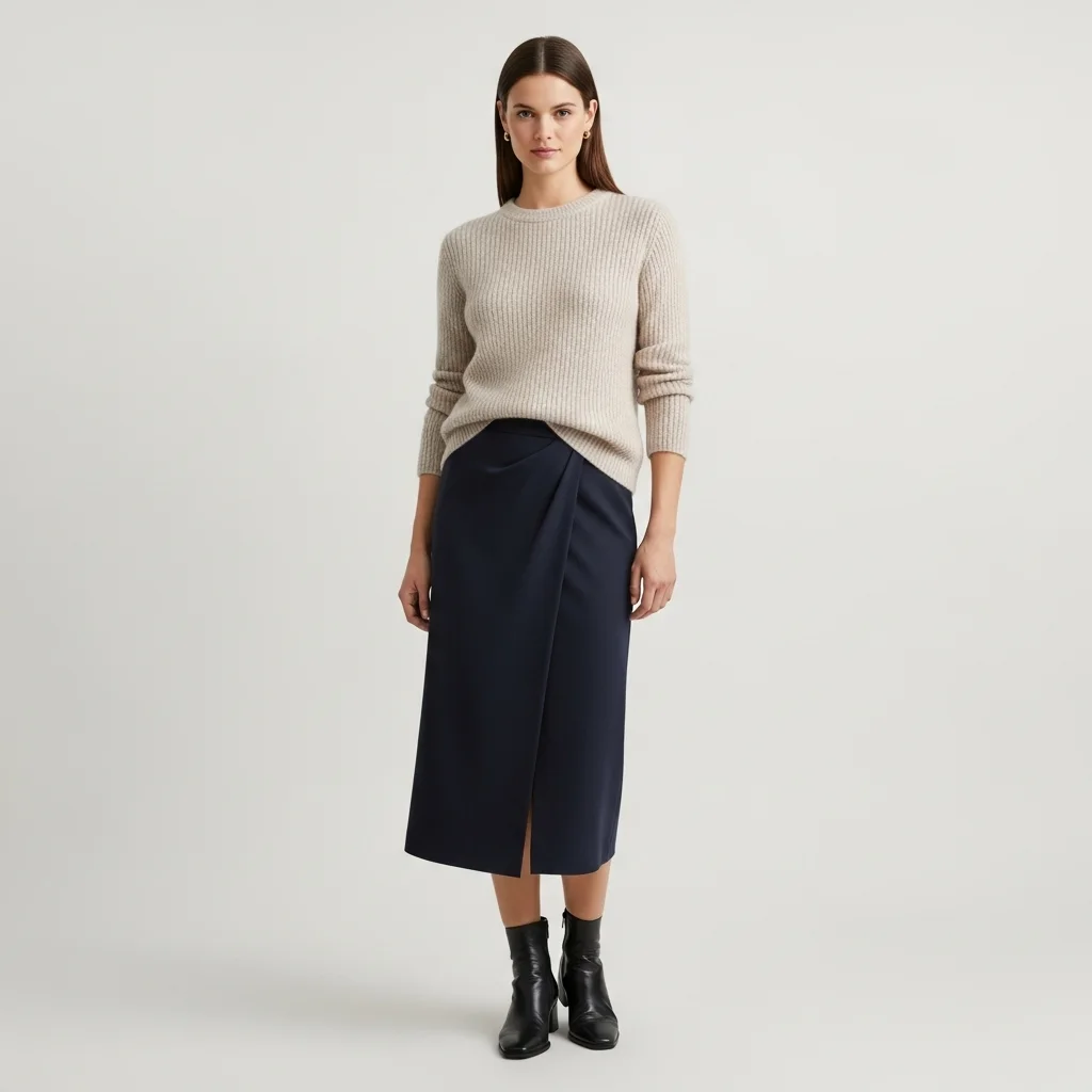 A quality sweater paired with tailored pants creates a polished yet approachable look. Choose a sweater in a fine gauge knit—nothing too chunky or oversized. Crew necks, V-necks, and boat necks all work well in professional settings. The pants should be well-fitted and pressed, in a complementary or matching color. This outfit works particularly well during transitional seasons and can be easily adapted by adding or removing a blazer. Complete with loafers, oxfords, or low heels.