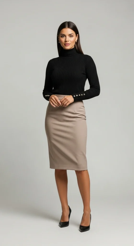 A fitted turtleneck paired with an A-line or pencil skirt creates a sophisticated, streamlined silhouette. This outfit works beautifully across seasons—opt for lightweight knits in warmer months and heavier cashmere or wool blends when temperatures drop. The turtleneck provides excellent coverage while still looking fashion-forward. Choose a skirt in a complementary color or a subtle pattern like houndstooth or pinstripes. Complete the look with ankle boots or pointed-toe flats.