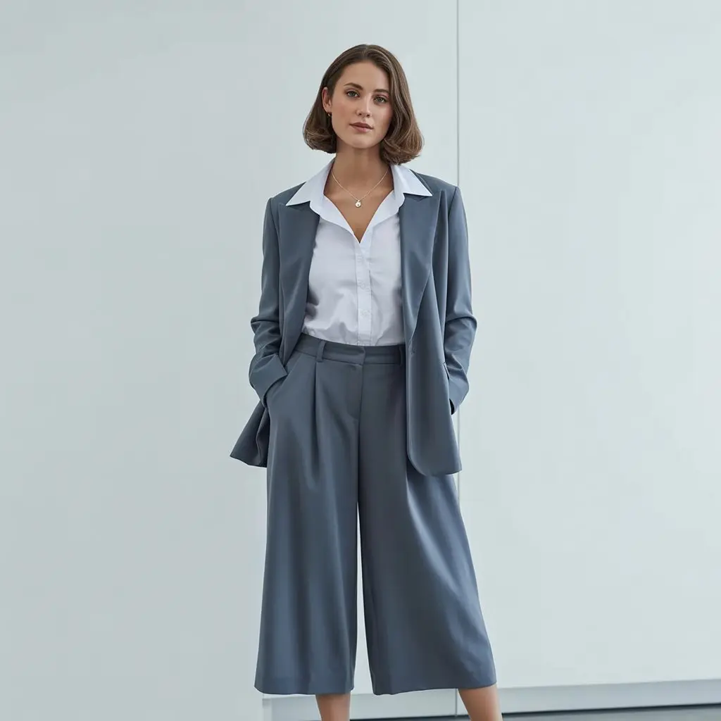 Culottes offer a modern, fashion-forward approach to business casual. These wide-legged cropped pants work best when paired with more fitted tops to balance proportions. Choose a structured blouse or fitted sweater in a complementary color. The key to making culottes work in a professional setting is selecting the right fabric—opt for structured materials like wool blends or heavy cotton rather than flowing fabrics that might appear too casual. Add heeled mules or block heels to elongate your legs.