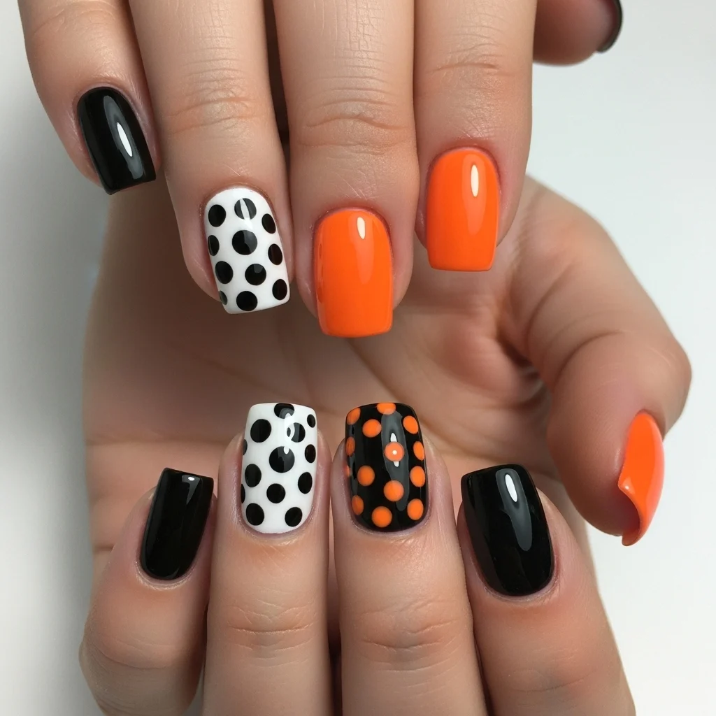 Alternate-color nail design: black solid and orange. Paint opposite-color orange or black polka dots—flip when dry—sponging them onto nails with a dotting tool. Alternate bigger and smaller dots or paint lines of dots along nail bed diagonals to get. On short nails, substitute medium dots with very big dots for proportion. This retro design is easy to get, but with sensational pictures, ideal for Halloween parties.