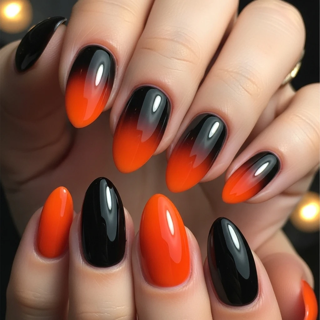 Use orange polish from the tips and grading towards the center of the nail bed with a makeup sponge for soft ombré. Build up the color gradually and apply layers of color incrementally instead of one too-thick layer. The gradient would be covered by the black background. This technology-driven design achieves the illusion of short nail length and employs traditional Halloween colors in a new, trendy manner ideal for any October observance.