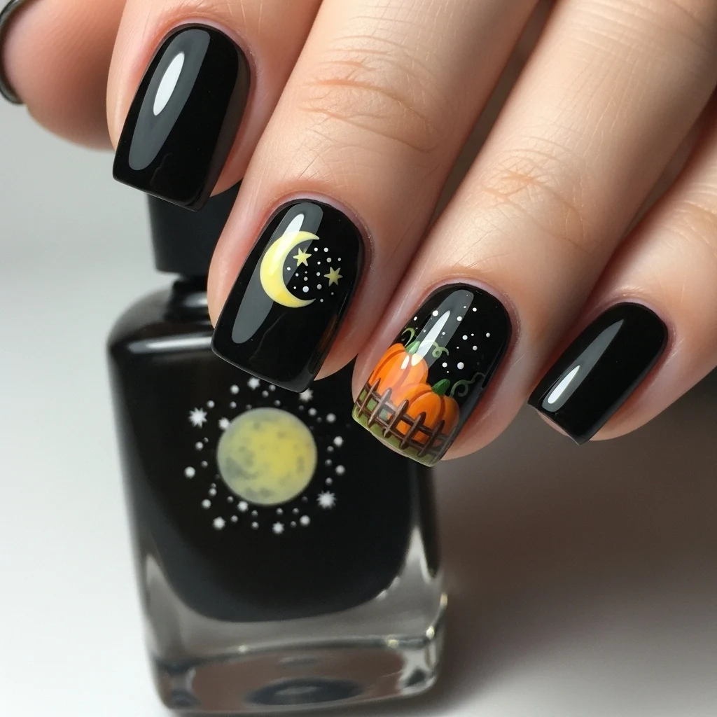 Blast off into outer space with this spooktacular Halloween nail look with shiny black base nails.