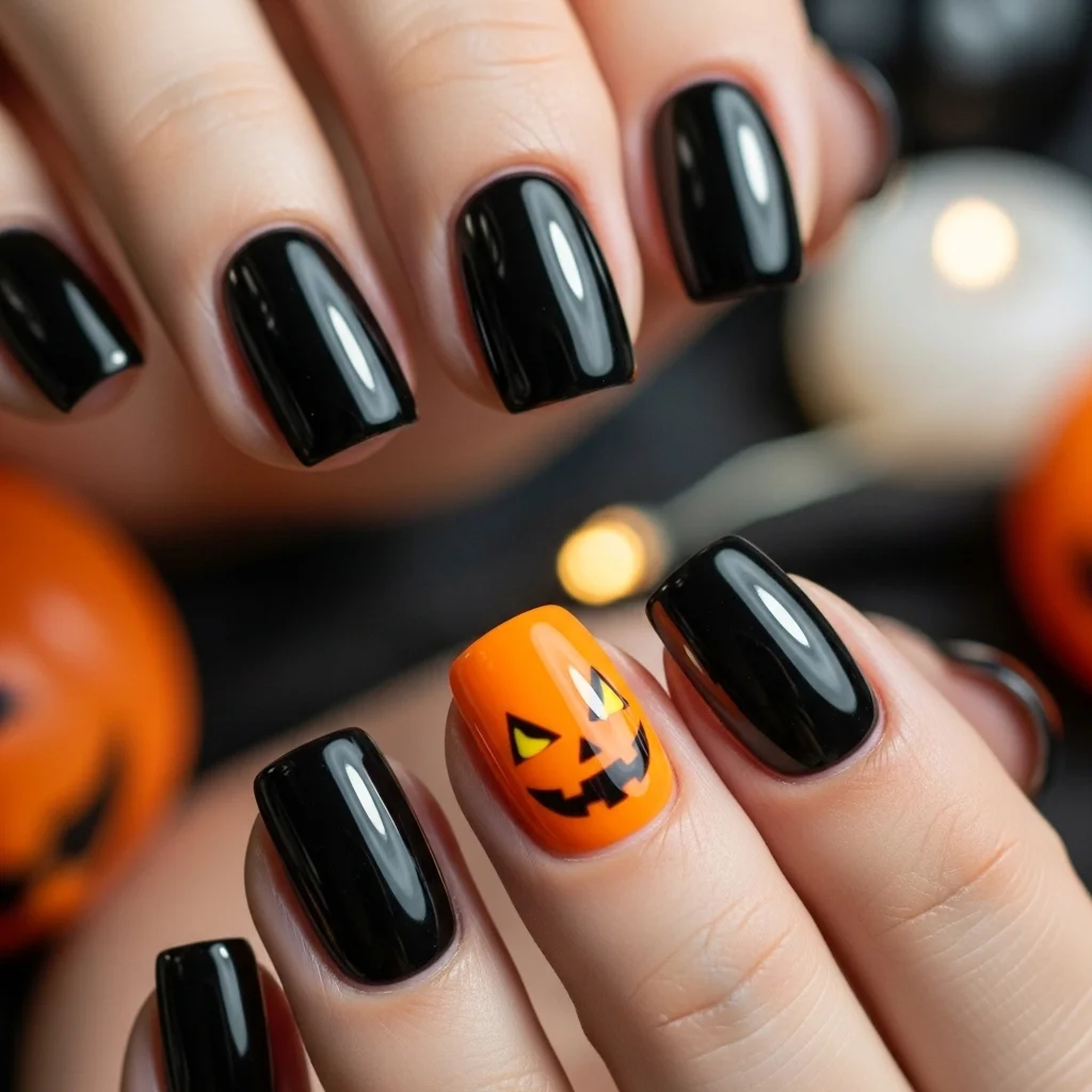 Paint four complete black shaded nails and save one accent nail on each hand for adorable jack-o’-lanterns.