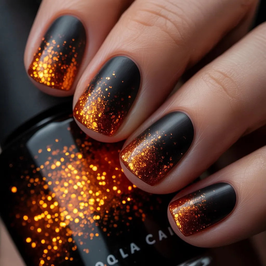Apply orange glitter polish with a makeup sponge from the tips to the cuticle for a gradient finish, fading to the cuticle. Key to success with this one is glittering with light dabbing motion, graduating color on tips, which is particularly effortless with short nails since the gradient has less room in which to work its magic. Matt top coat on the black part alone and leave glitter tips for a shiny finish to have contrast.