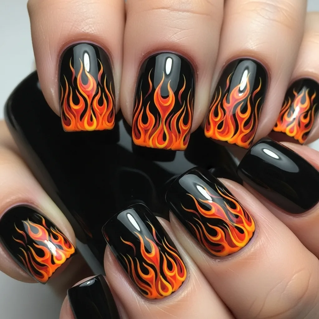 Orange flame creates a rising from each tip, transparent polish using a detail brush, and orange polish. Waved tipped flames in graduated size, filling the tiny ones between the tallest for extreme depth. Red or yellow polish streaks flames for extra depth. This is a fast nail art too because the flames will not be long enough to create with in hope of crafting mammoth drama, and the floating up trick also stretches nails a bit.