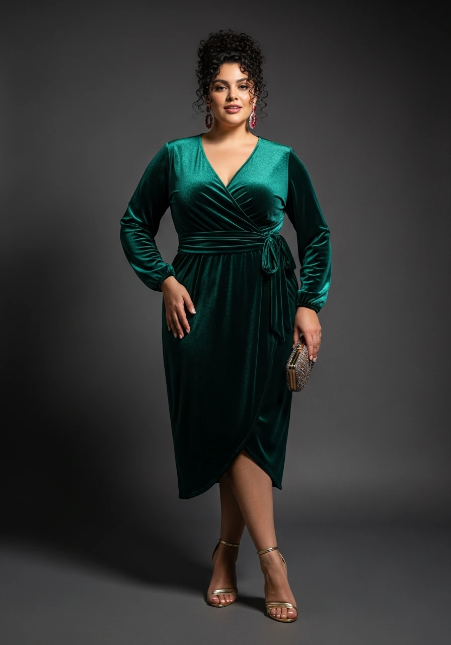 Velvet screams luxury. A wrap dress in deep jewel colors like emerald, sapphire, or ruby hugs your curves perfectly while the wrap style cinches your waist in a gorgeous way. Pair strappy heels and statement earrings for a chic, effortless style that looks stunning in photos.