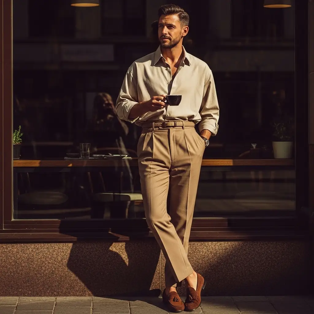 Choose a loose-fitting shirt of a vibrant color—burgundy, forest green, or mustard yellow—and pair it with neutral-colored contrasting trousers. Burgundy shirt and light grey chinos, mustard shirt and navy trousers are out of the general combination, but in the right context. Shoes and accessories must also be neutral so that the shirt receives attention-grabbing attention. The outfit is suitable for social gatherings, casual dates, or any event when you need to impress low-key.