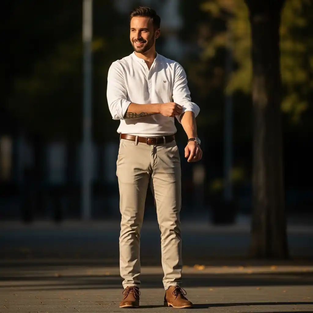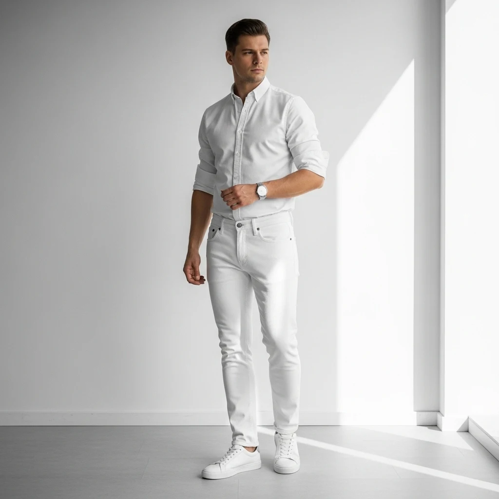 The foundation of this clean, minimalist outfit is a white casual shirt. Pair it with white or cream chinos, metallic accents, and white sneakers. The secret to getting away with all-white is contrast of texture and tone—mix off-whites and creams with jarring whites. Keep each piece spotless since this look has no room for defects. This is a bold style suitable for sunny days or tropical environments.