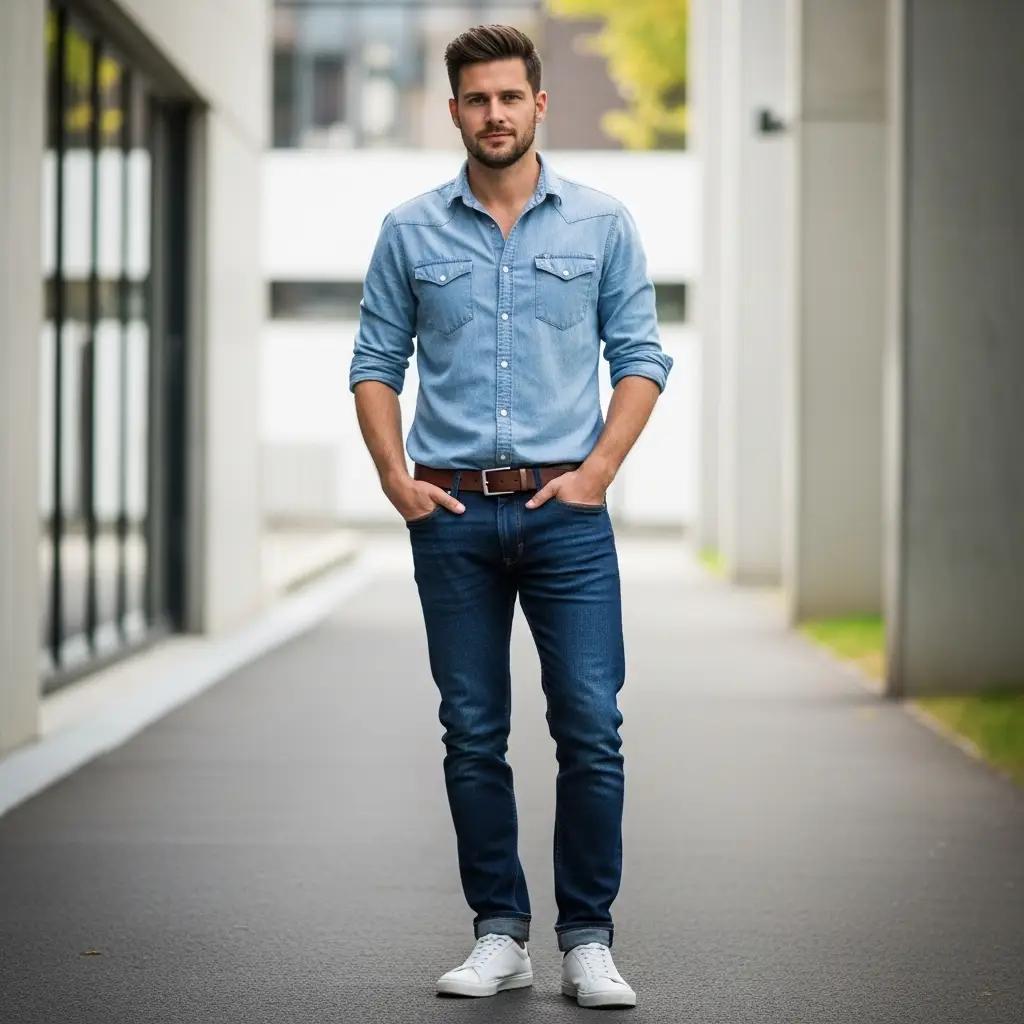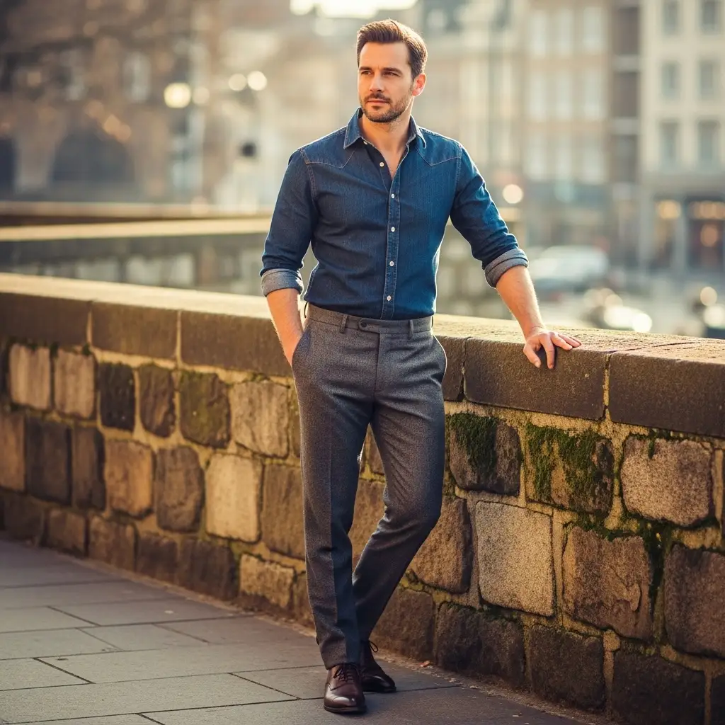 Wear the denim shirt dressy-casual by matching it with slim-fit wool pants and leather dress boots. This is suitable business-casual wear for creative workplaces or evenings out on the town. Employ dark wash denim for formal looks, and have it pressed crisply—rumpled denim would be too casual for this ensemble. Add a leather watch and a blazer if the evening requires additional sophistication.