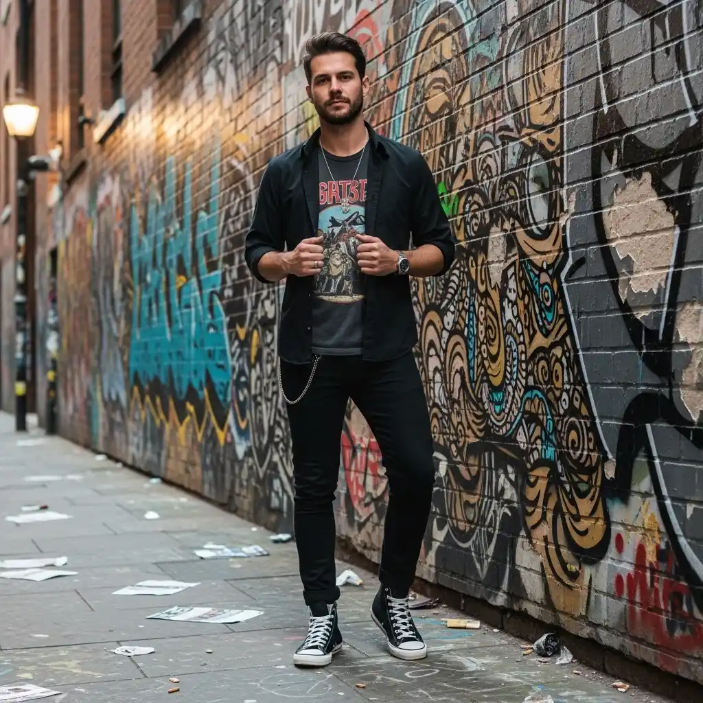 Put on an open plain casual button-down shirt over a graphic t-shirt that displays your personality or passion. Throw in black jeans and high-top sneakers. The plain shirt serves to frame your graphic shirt without taking over your personality. Put on graphic shirts with retro prints, band logos, or graphics. Put on a plain outer shirt—white, black, navy, or gray is fine.