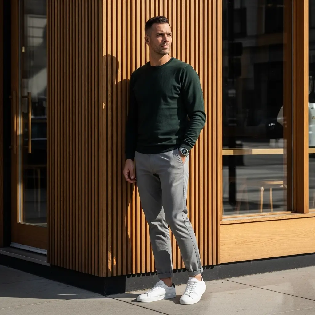 Create a full outfit using varying hues of a single color group. Try a light gray shirt and charcoal trousers and gray loafers, or an ivory shirt and cream trousers and off-white loafers. The elegant dressing gives a sense of visual height and glamour without ever appearing rumpled. Add depth through layering of texture—plain cotton top with thick knit trousers or vice versa. A watch or plain gold or silver chain provides just enough contrast without disrupting the monochromatic chain.