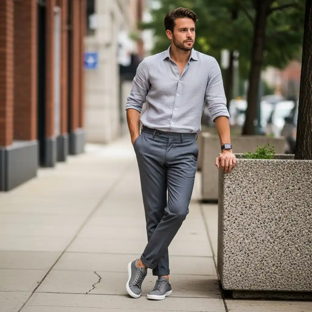 Stack a classic casual button-down (tucked in) over a streamlined athletic top, with joggers and high-fashion sneakers on top. Go for dressier joggers in richer neutral hues—black, navy, or gray—rather than those too athleticism-driven. The modern mashup is half comfort, half thoughtful styling, perfect for travel days, everyday offices, or weekend excursions. The inverted image of the clingy top-hugging top and loose joggers creates an interesting visual appeal that is clean and unstuffy-looking.
