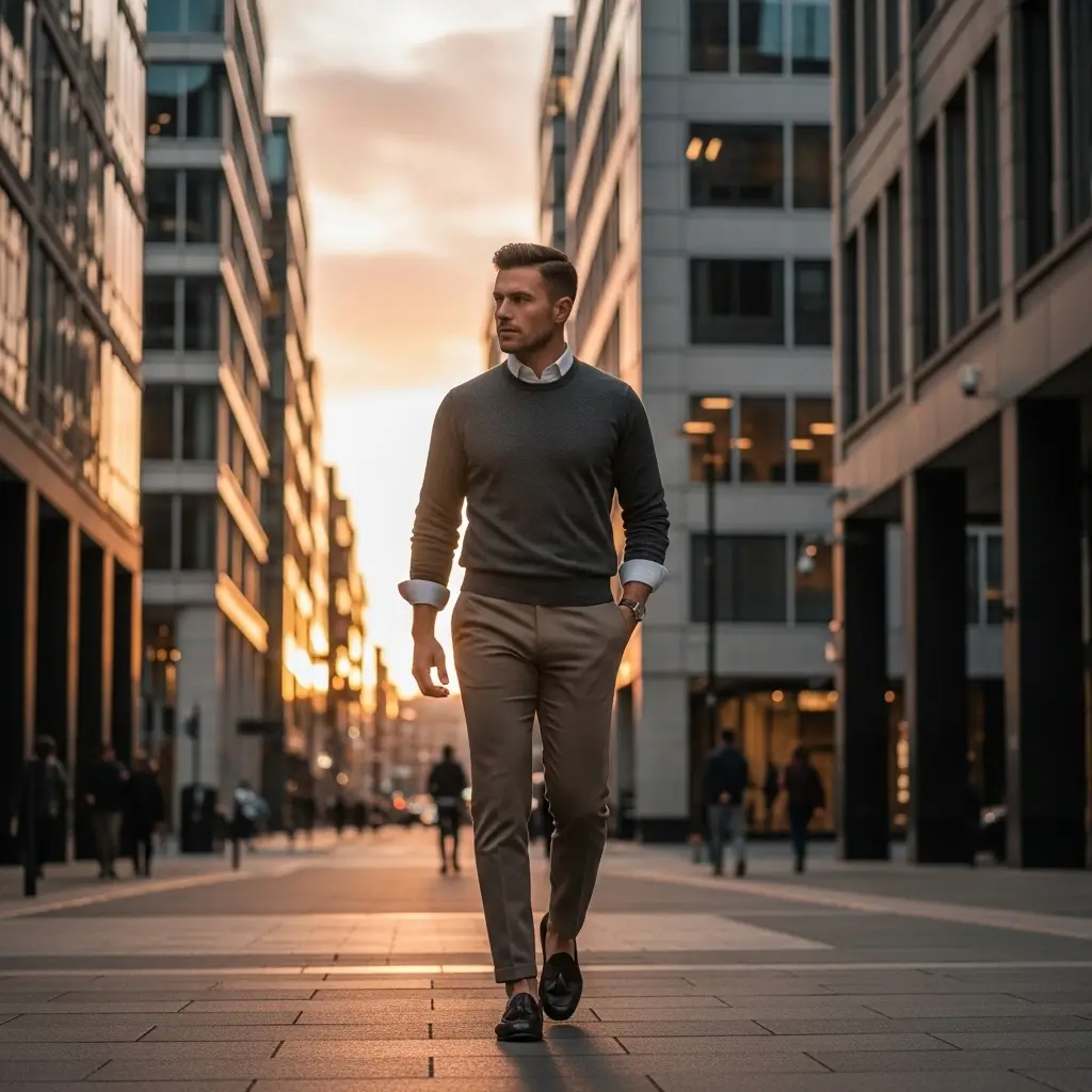 Layer a light crewneck sweater over a collared dress shirt such that the shirt collar and bottom hem are visible. The prep-casual look will best be paired with chinos or dark wash jeans. Go for contrasting colors—navy sweater over white shirt, gray sweater over blue shirt—to get the maximum effect. Loafers or white sneakers make the look down-to-earth. The secret to getting your shirt collar to lie flat under the sweater and both pieces to be fairly fitted without bulging up.