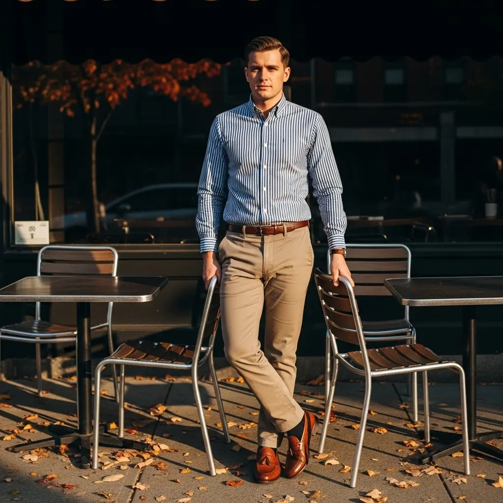 Vertically striped casual tops create visual length and a retro cool. Match a navy or khaki top with blue-and-white striped navy or khaki chinos, brown leather loafers, and a coordinating belt. Tuck in the top for dressy-casual, or leave it out with the bottom buttoned for active-casual. Stripes are most attractive when they’re in the same color family as your pants—that’s coordinated without matching. Roll the sleeves up for added casual cool.