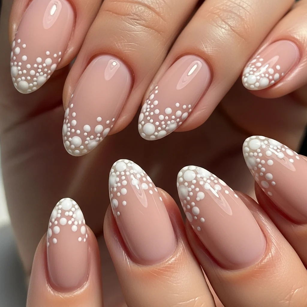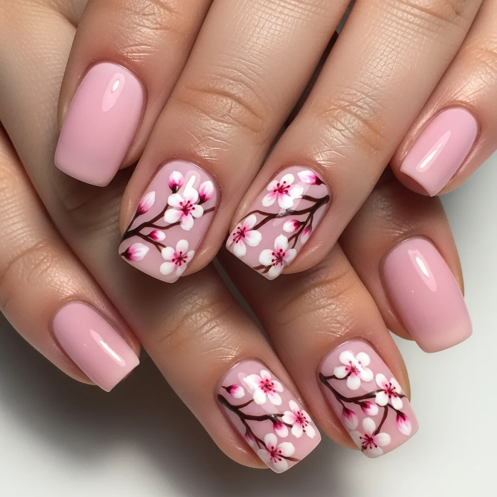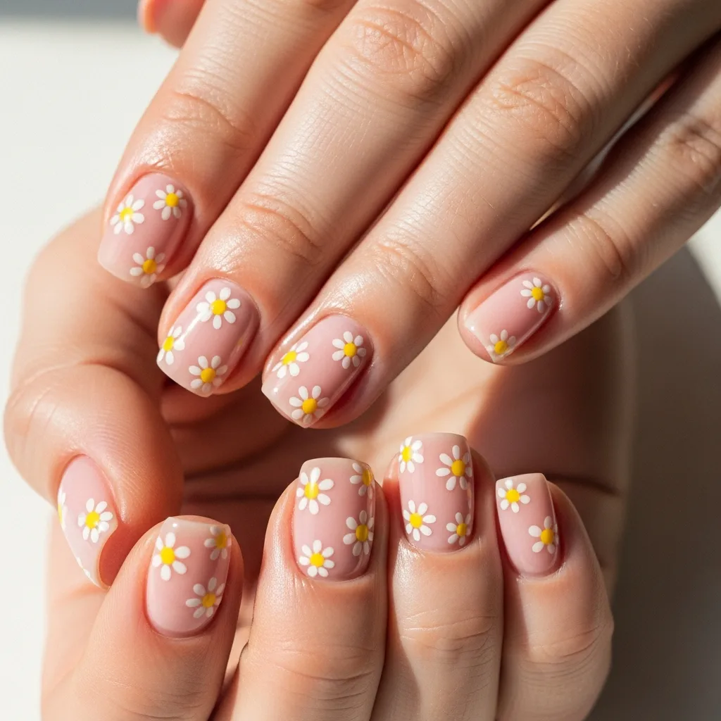 Let’s apply a soft pink or nude nail base and then paint simple white daisies with yellow centers with the help of a dotting tool. This is a timeless look that is perfect for nail art beginners to achieve.