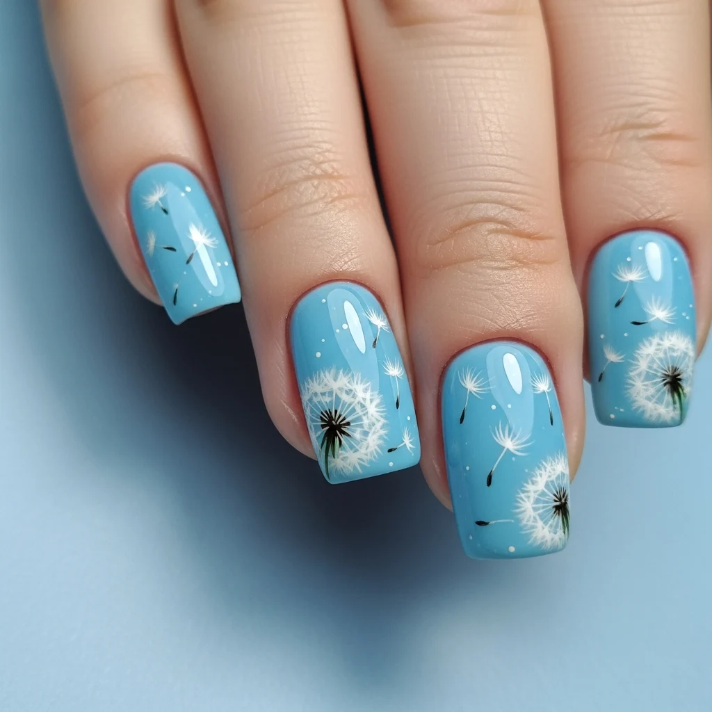 Add white dandelion seeds floating against the background of a light blue sky. Create white seeds with white polish and a fine brush. look at this…