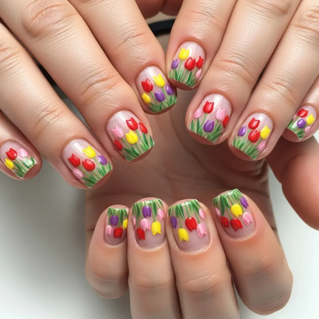 Arrange vibrant tulips in a line across your nail tips. Tulips in red, yellow, pink, and purple hues symbolize spring.