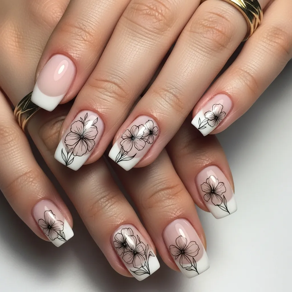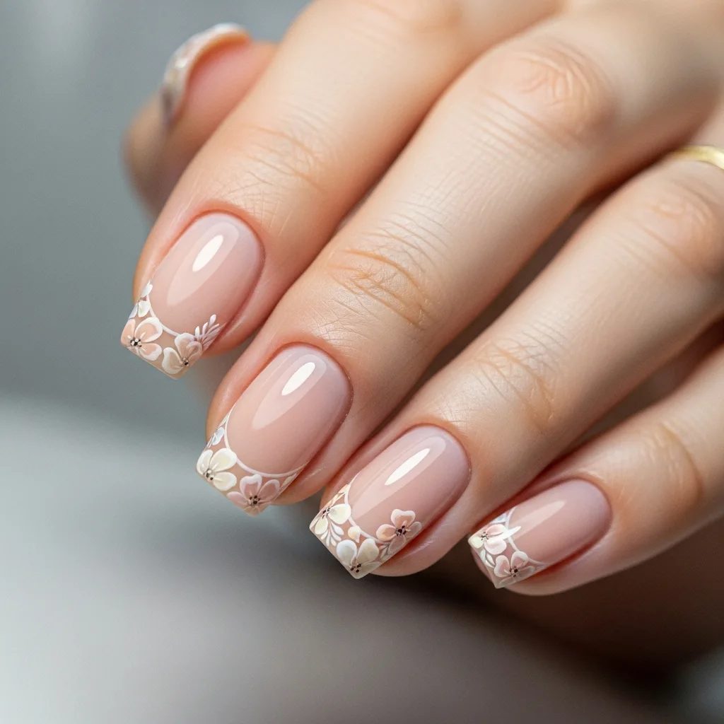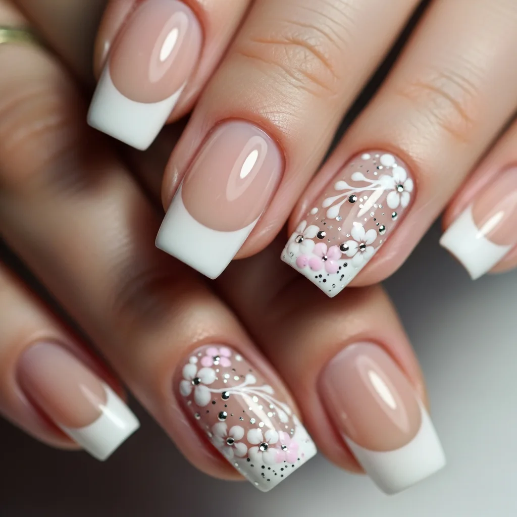 This style adds a touch to your classic French manicure by painting flowers at the tip line. This is a subtle way to bring out your natural beauty without overshadowing it.