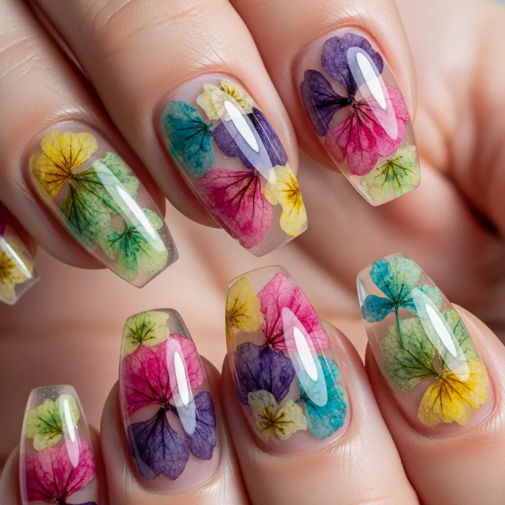 For a real pressed flower look, one can use real dried flowers with gel or add floral nail decals. This method does not require any painting skills.