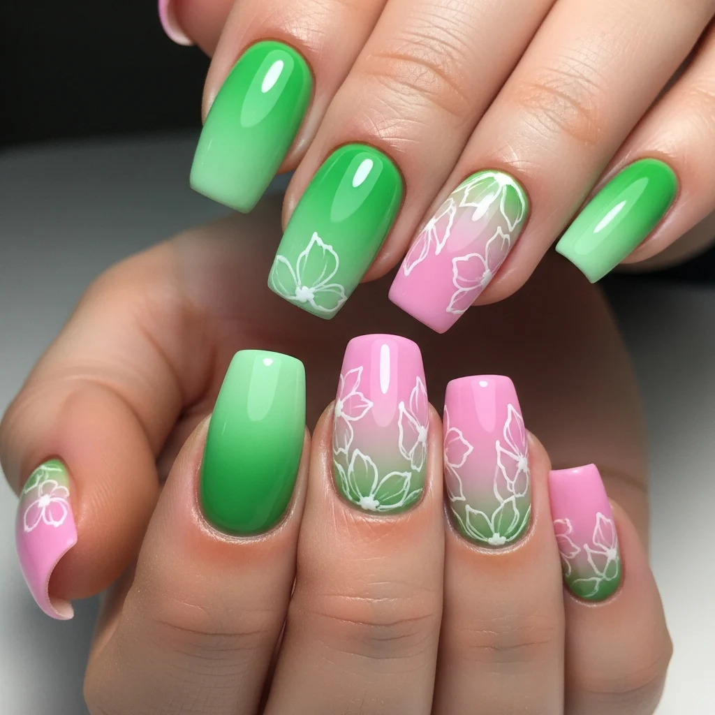 Fade out with green at the cuticle and then with pink to the tip. Add white highlights to the flowers. This is to create depth.