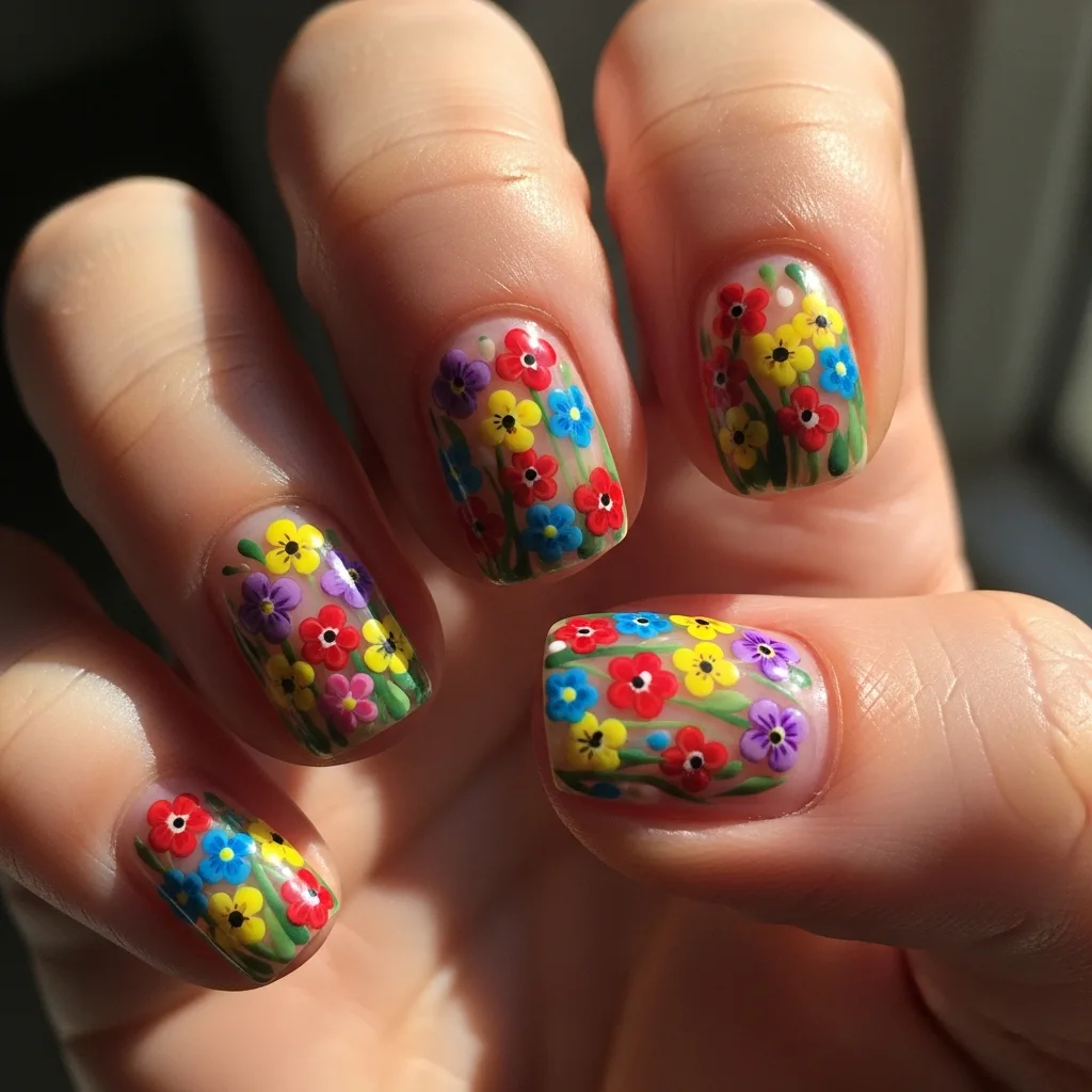 Mix small flowers in varied colors on every nail. Employ the usage of reds, purples, yellows, and blues to resemble a natural meadow. This is a busy pattern that makes a statement.