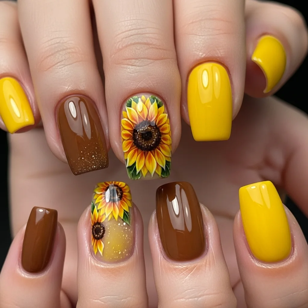 Display one large sunflower on your ring finger with the remaining nails painted in solid yellow or brown. This is one of the easiest nail art designs to achieve.