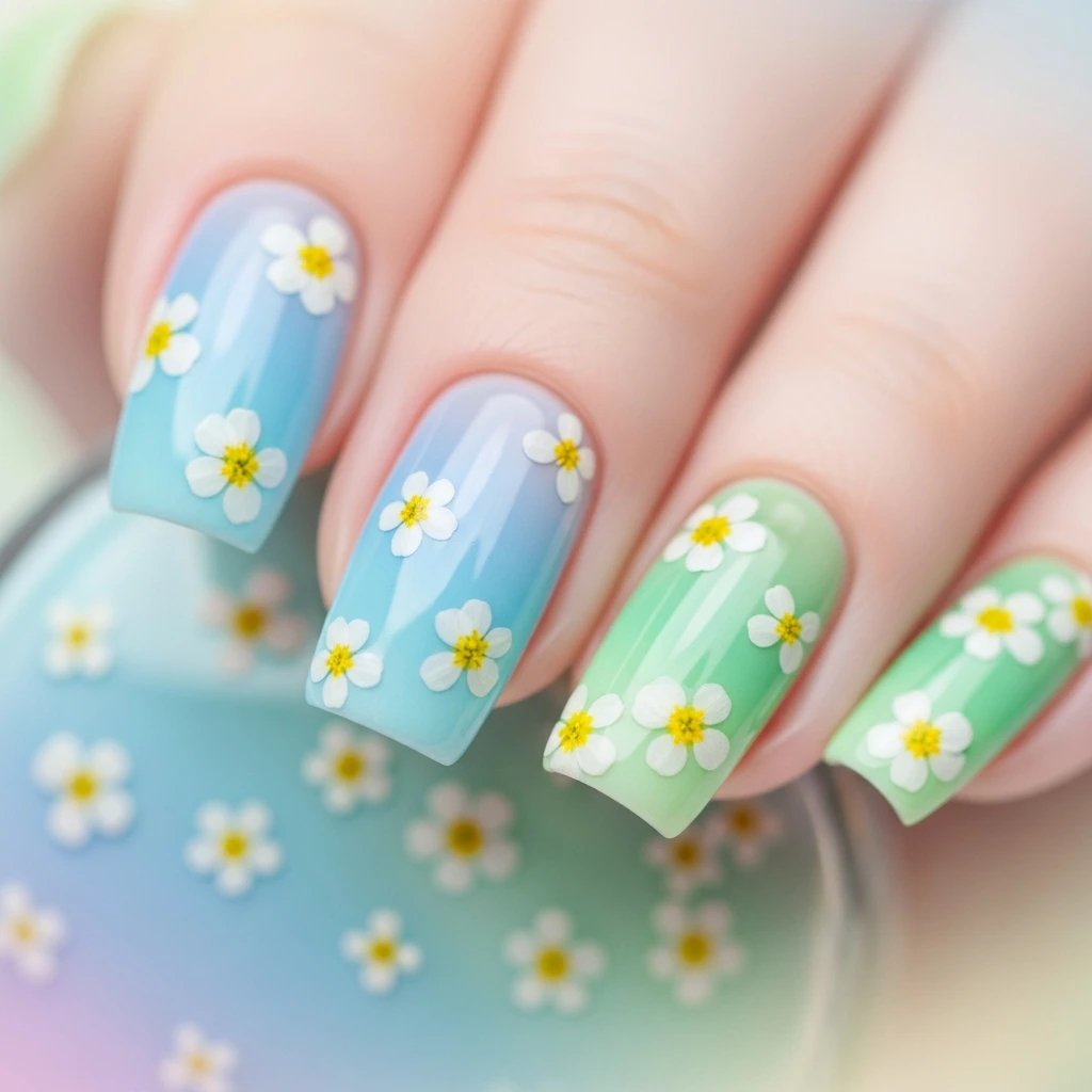 Start to apply a gradient effect ranging from blue to soft green. Finally, add small white and yellow flowers.