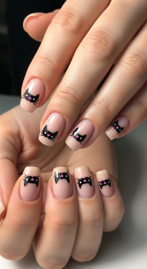 Silhouettes of black cats with pink-colored noses and ears will bring a touch of playfulness to a Halloween manicure. They will look great against a nude, white, or pale gray background.