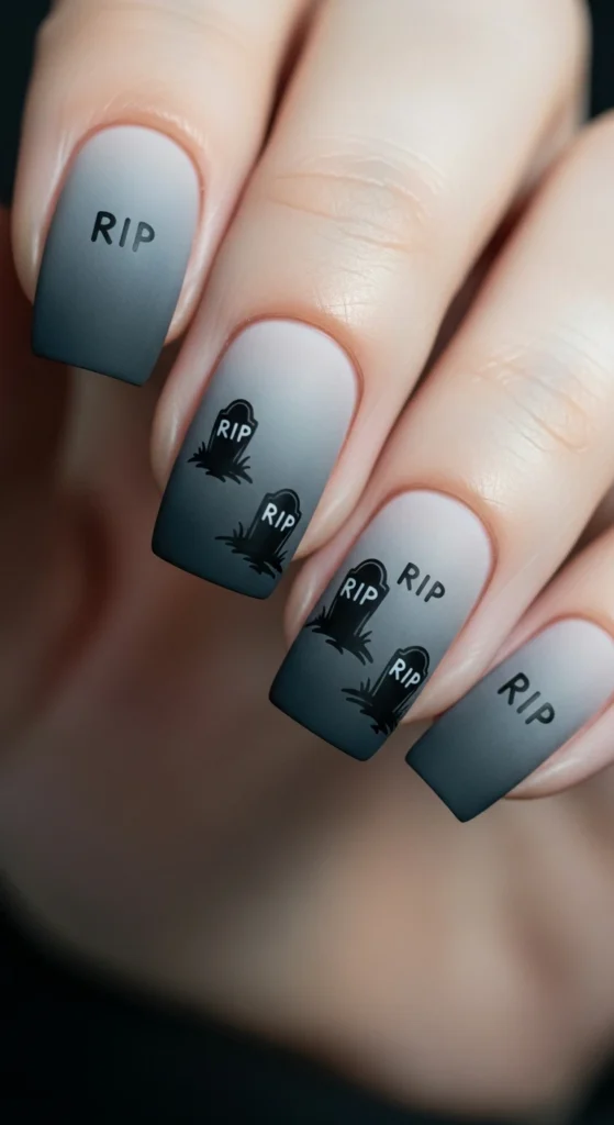 Small gray gravestones on one or two accent nails keep the design subtle yet seasonal. Add small “RIP” lettering details.