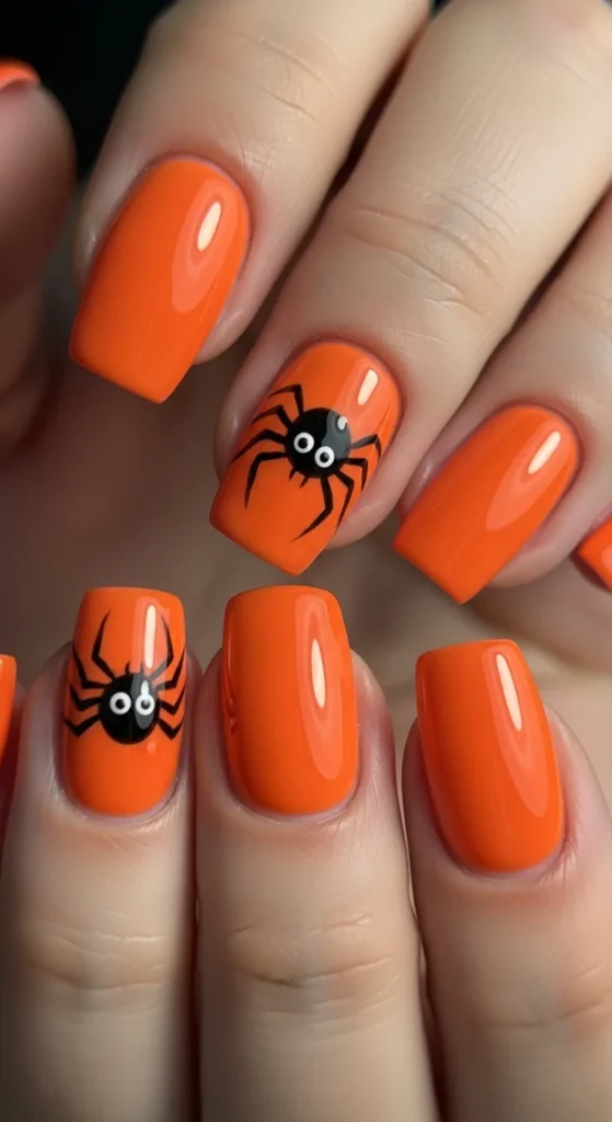 A believable spider or a cartoon spider on one of the fingers of the ring hand is a great way to draw attention to the nails without overdoing the look. Paint the rest of the nails in matching solid colors.