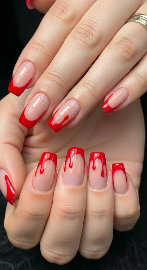 A “dripping” red tip is actually quite stunning as a French tip manicure trick. Give it a sophisticated touch with a nude polish base.