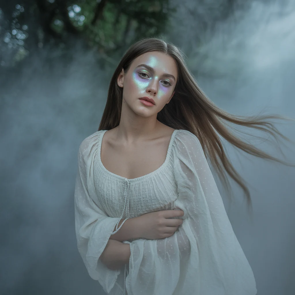 Take that simple ghost and make it sophisticated with a flowing white gown, accented with silver. Then add ethereal makeup with glitter and soft contours.