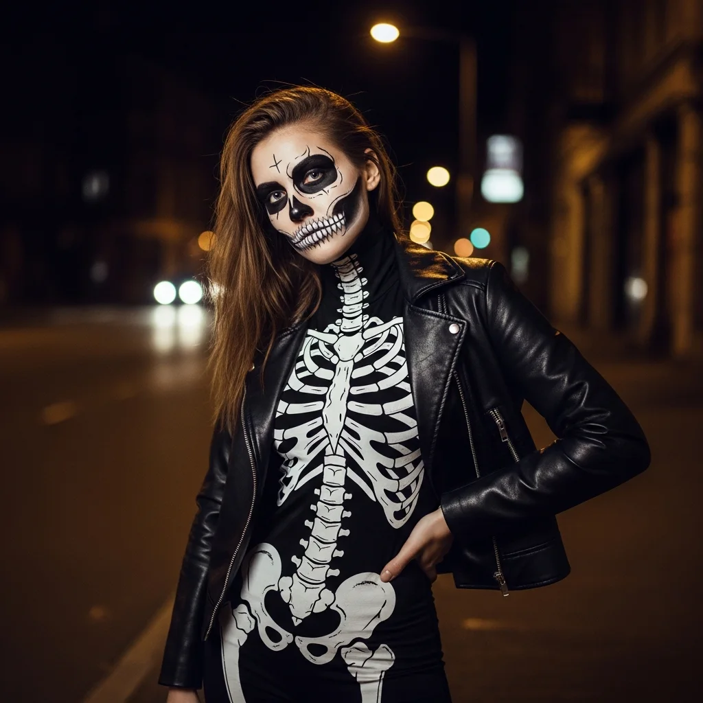 Go all out with some face paint in a black bodysuit with skeleton bones; then add some edge with a leather jacket and boots.