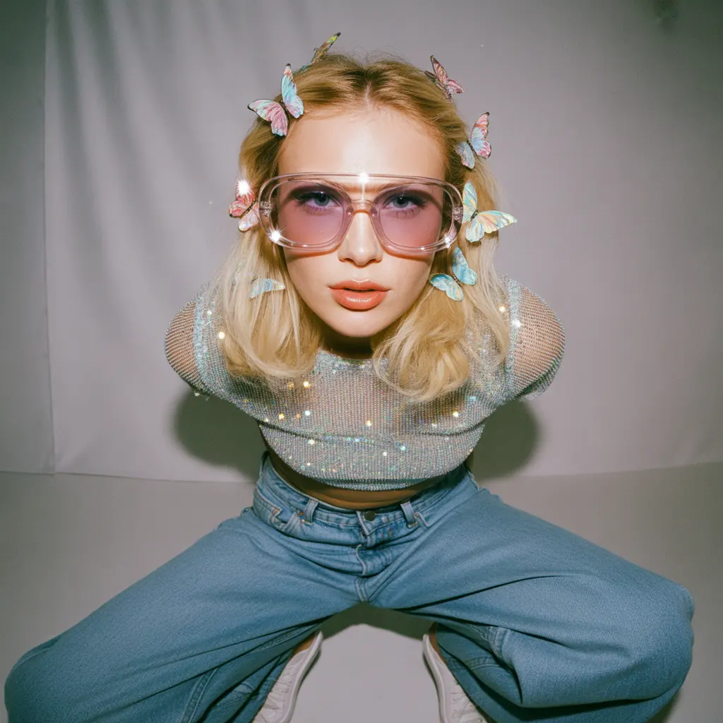 Think low-rise jeans from the early 2000s paired with butterfly clips, colored sunglasses, and a crop top à la Paris Hilton or Britney Spears.
