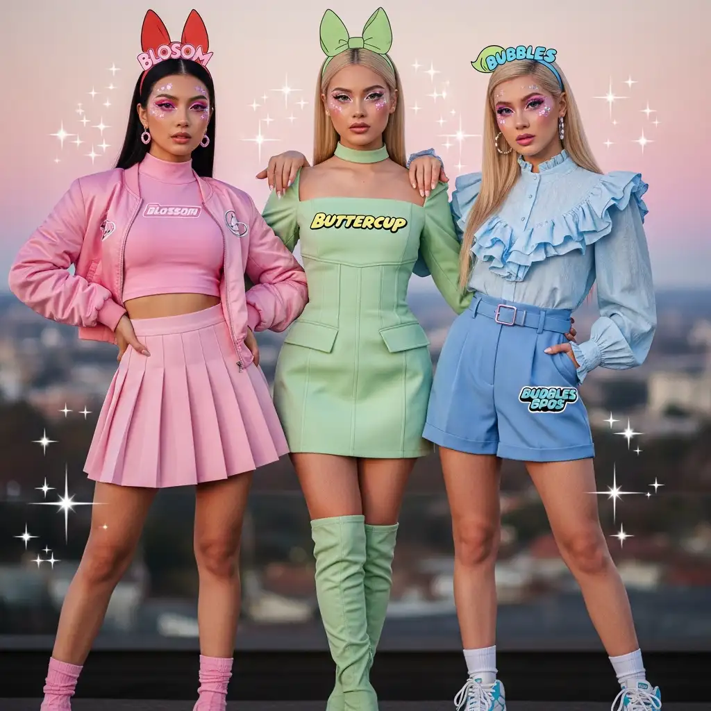 Classic three-person costume. You can be Blossom, Bubbles, or Buttercup-just match up your signature color with black belts and white tights.
