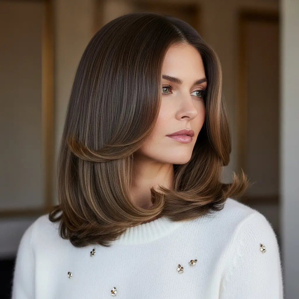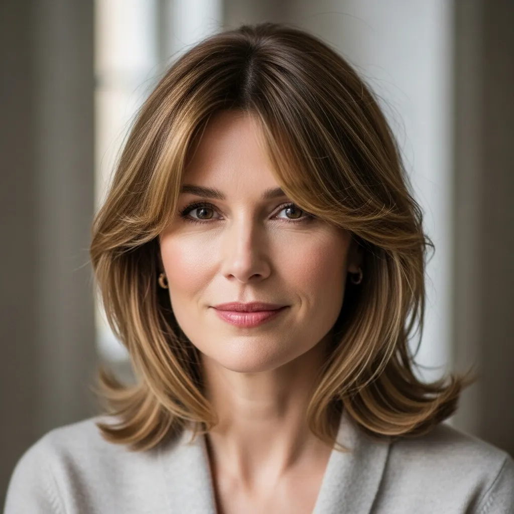 Curtain bangs that part in the middle and frame the face, adding softness to shoulder-length hair. This style requires minimal maintenance—simply blow-dry with a round brush, directing bangs away from the face. The key is keeping them long enough to blend seamlessly with the rest of your hair.