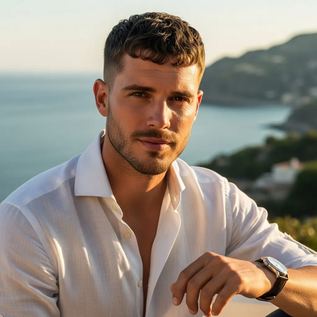 This British classic keeps hair very short on the sides and back with more length on top for styling. It’s clean, masculine, and universally flattering. The contrast between short sides and longer top creates definition and structure that looks intentional and polished.