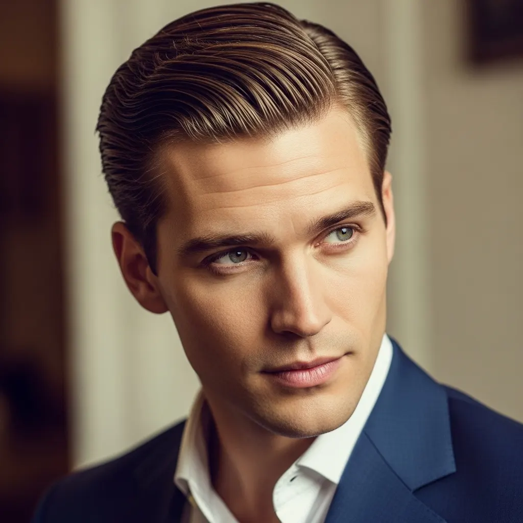 This modern take on a classic combines short, faded sides with longer hair on top that’s slicked straight back. Apply a medium-hold pomade to damp hair and comb back from the hairline. The look should be polished but not overly stiff, with enough product to hold the shape while allowing some movement.