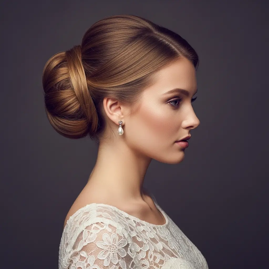 This timeless updo has graced elegant events for generations. Gather hair to one side at the nape, twist upward along the back of the head, and tuck the ends into the twist. Secure with bobby pins inserted vertically into the twist. The French twist should be smooth but not overly tight, maintaining a soft, romantic silhouette. A few wisps around the face add that perfect, undone element.