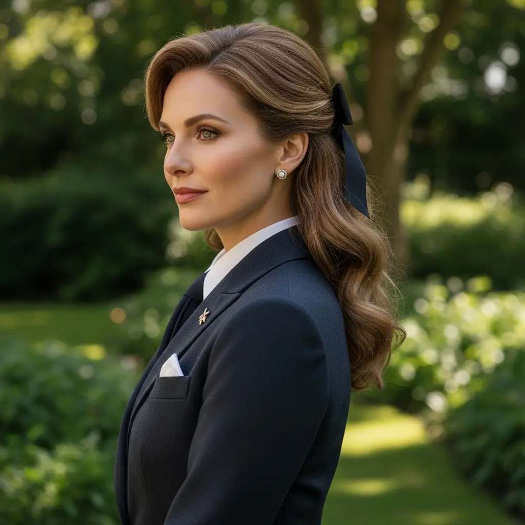 This youthful yet sophisticated style is ideal for garden parties and daytime events. Take sections from each side of the head, twist them back, and secure with a ribbon bow at the crown. The remaining hair can be left straight, wavy, or curled. Choose ribbons in classic colors like navy, black, or cream for authentic old money appeal.