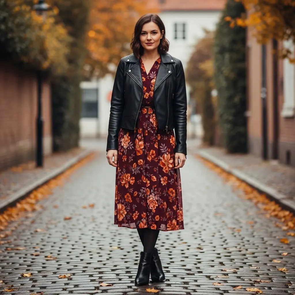 Fall is the perfect time to embrace leather jackets, and pairing one with a midi dress creates an unexpectedly sophisticated outfit. Choose a fitted black or cognac leather jacket and layer it over a midi dress in a fall print—think floral, polka dots, or geometric patterns in autumn colors. Midi dresses offer the right balance of elegance and practicality, hitting below the knee for a polished appearance while remaining appropriate for various settings. Complete this look with black tights and ankle boots for a seamless line from hip to toe. This outfit strikes an impressive balance between edgy and elegant, making it perfect for dinner dates, social gatherings, or even business-casual environments when styled appropriately.