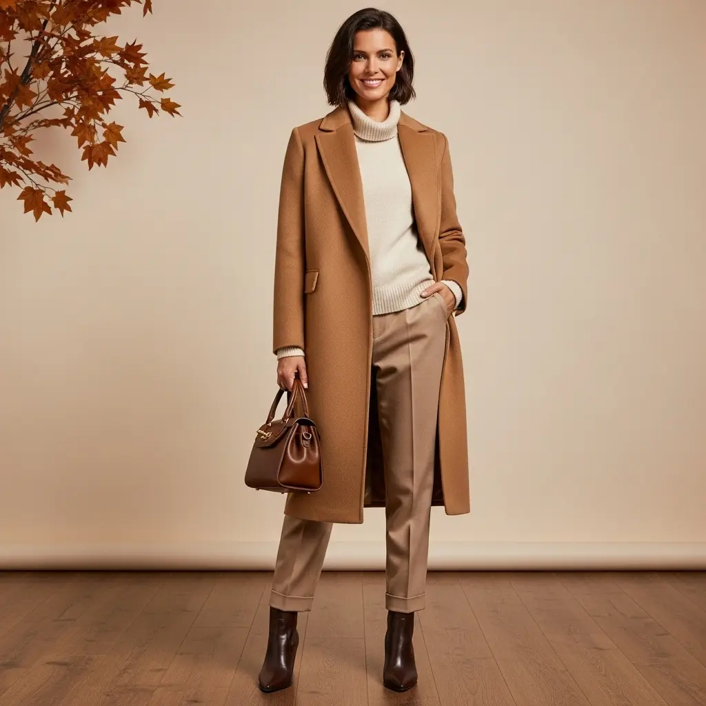 A camel coat is perhaps the most essential fall piece, and it deserves a showcase moment. This timeless neutral serves as a perfect canvas for building an understated, elegant outfit. Layer a camel wool coat over a cream or taupe turtleneck and add tailored beige or grey trousers that create a monochromatic palette. The simplicity of this color scheme allows the quality of your pieces to shine through. Accessorize with a structured leather handbag in chocolate or black, and add a pair of pointed-toe flats or heeled boots to elevate the look. This outfit exemplifies quiet luxury and is appropriate for professional settings, upscale casual outings, or anyone seeking a refined, sophisticated appearance during the fall months.