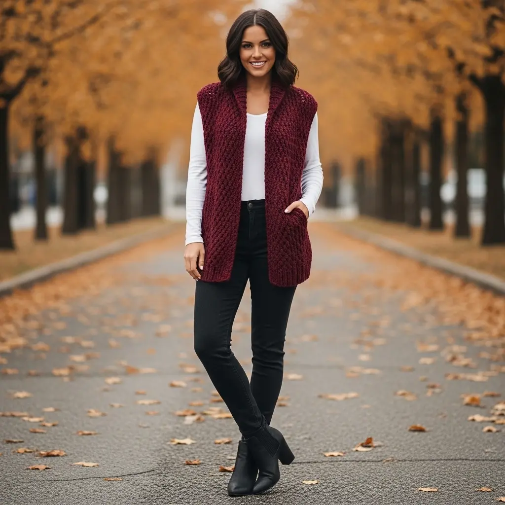 Layering is essential in fall fashion, and a knit vest offers the perfect solution for adding visual interest and warmth. Pair a chunky knit vest in burgundy, navy, or forest green over a fitted long-sleeve turtleneck or fitted long-sleeve tee in white or cream. Add slim-fit black jeans and complete with ankle boots or sneakers, depending on your destination. The beauty of this outfit is how it allows you to play with colors and textures while maintaining a cohesive, put-together appearance. A knit vest creates dimension in your outfit while serving the practical purpose of adding a layer without the bulk of a full jacket. This look works beautifully for casual Friday outfits at work, weekend shopping trips, or relaxed social gatherings. Look at this